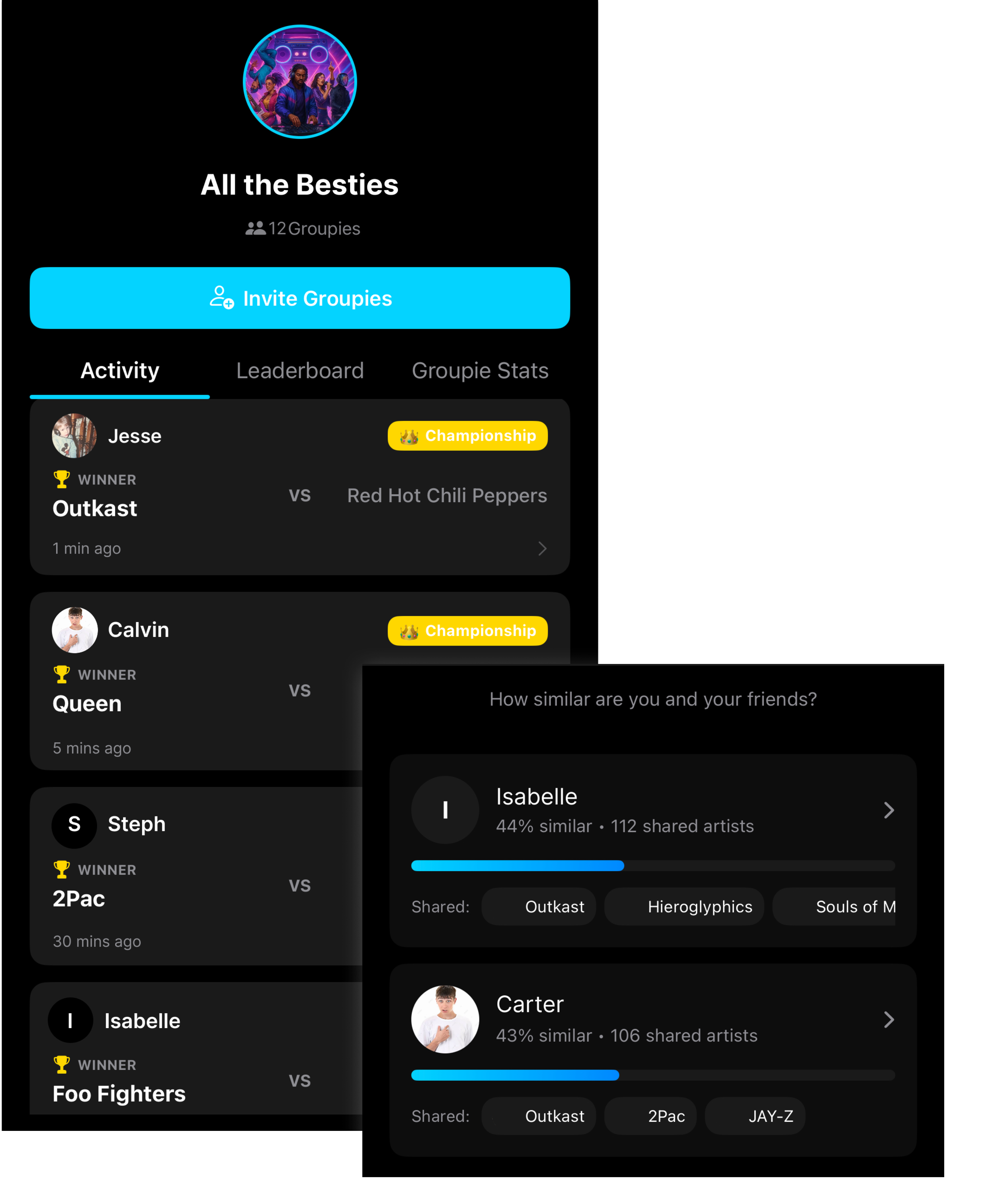 Create groups with friends and see who has the best musical taste. Compare your teams, compete together and see which artists you share.