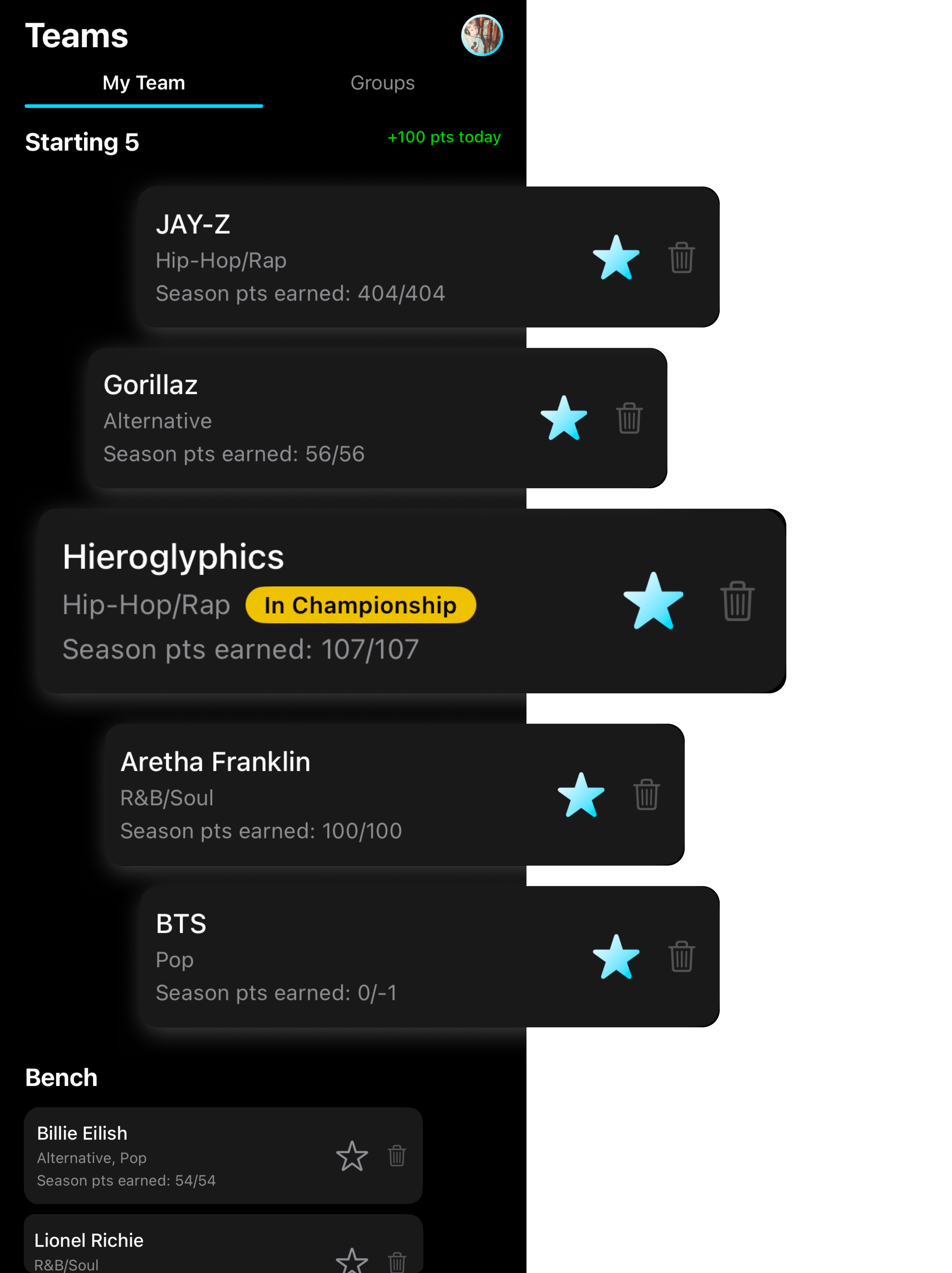 Find new music through playoff tournaments by genre. Help your favorites battle it out for the league championship.